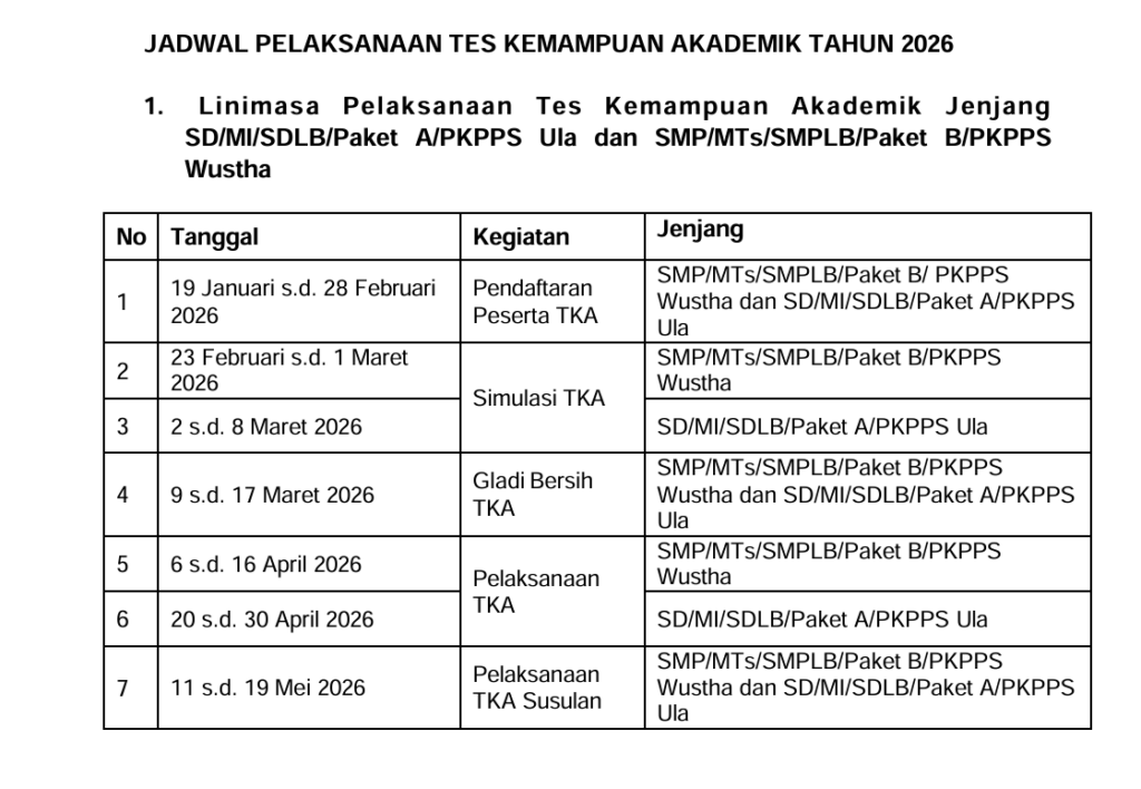 Dalam mempersiapkan kemampuan Akademik kelas 6 th 2026. perlunya kita mengetahui kapan akan di laksanakan Tes Kemampuan Akademik (TKA). adapun pelaksanaanya bisa d lihat fambar di bawah ini